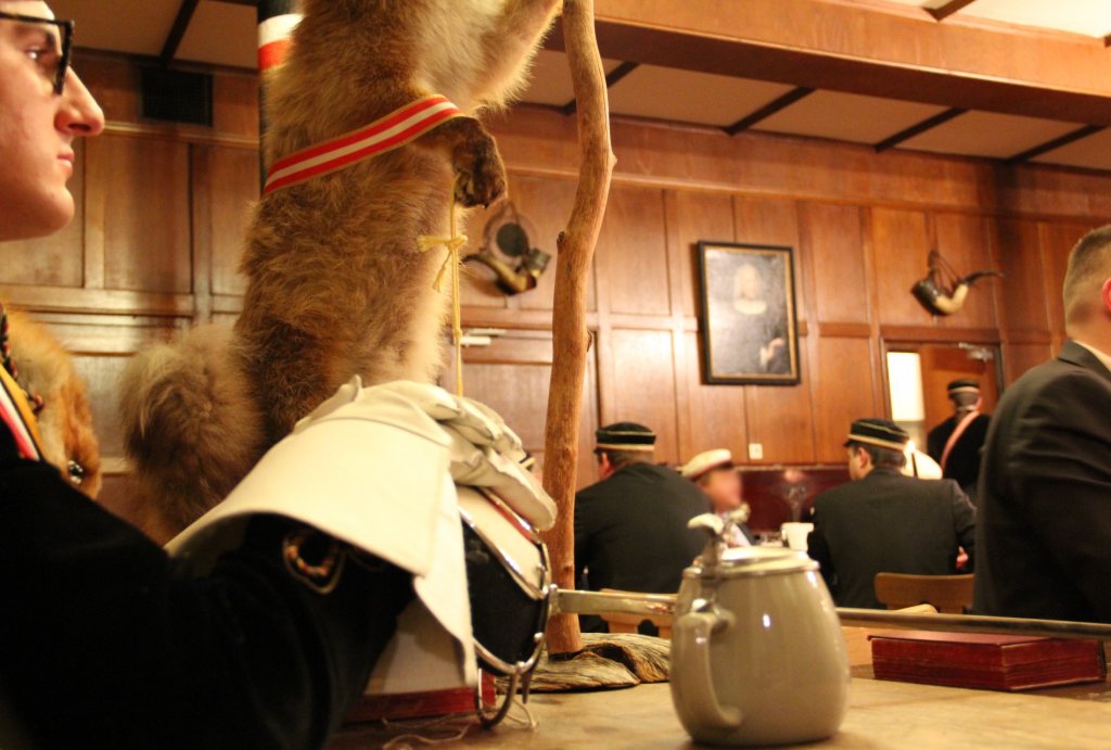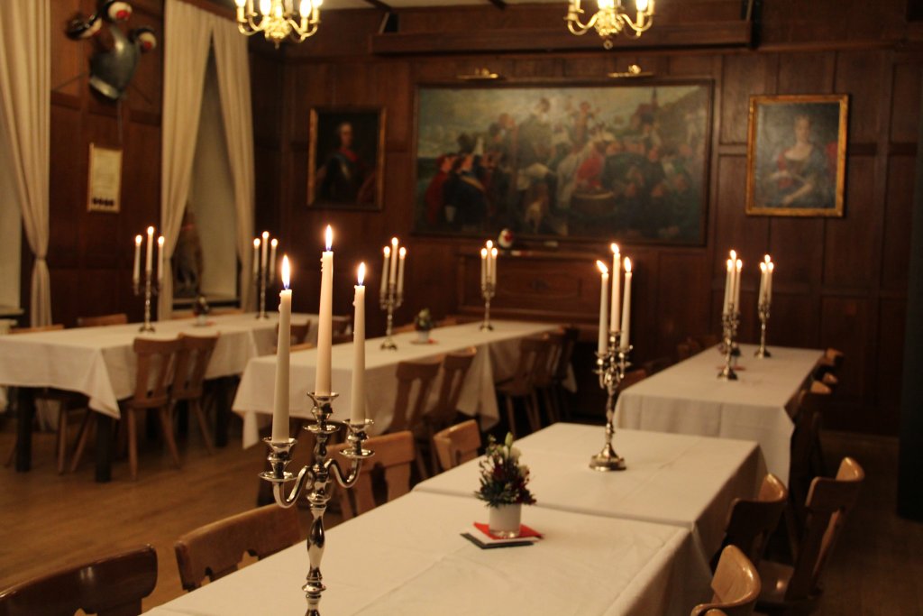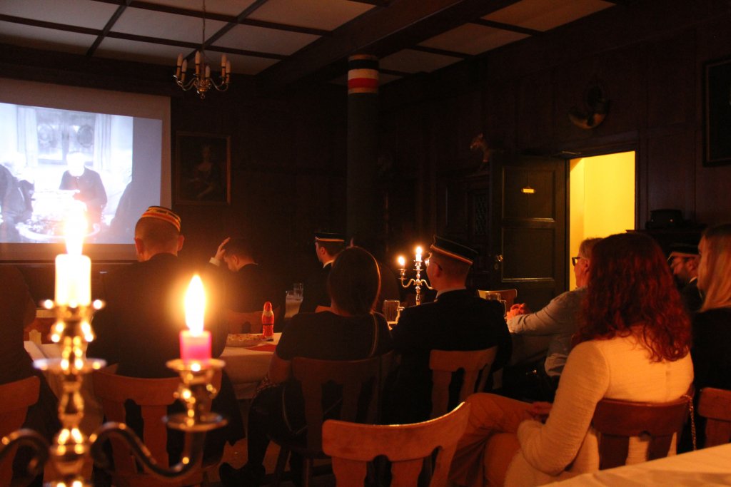In Vorfreude auf die besinnlichen Tage der Vorweihnachtszeit konnte man an diesem Wochenende bereits von der Straße aus sehend erkennen, dass auch auf dem Stauffenhaus die ersten festlichen Lichter zu leuchten beginnen. So wurde oberhalb unseres Balkons der große Weihnachtsstern aufgehängt und auch das Billardzimmer, vormals Bibliothek, mit einem gemütlichen Adventsstern in helles Licht gerückt. Die Augen der anwesenden Bundesbrüder und Gäste zum Leuchten gebracht hat jedoch vor allem die köstliche Feuerzangenbowle. Das Anbrennen der Zuckerhüte, vernaschen der kredenzten Köstlichkeiten und ruhige Momente im Kreise von Freunden und Familie machten den Abend zu einem der wohl ruhigsten in der sonst von Stress und Termindruck gezeichneten Vorweihnachtszeit. Nach einigen Tassen dieses vortrefflichen Getränks, guten Gesprächen und auch der ein oder anderen Partie Billard begaben sich die Anwesenden in den weihnachtlich angerichteten Kneipsaal. In alter Stauffentradition wurde hier gemeinsam der für die Veranstaltung namensgebende Film gesehen – „Die Feuerzangenbowle“.