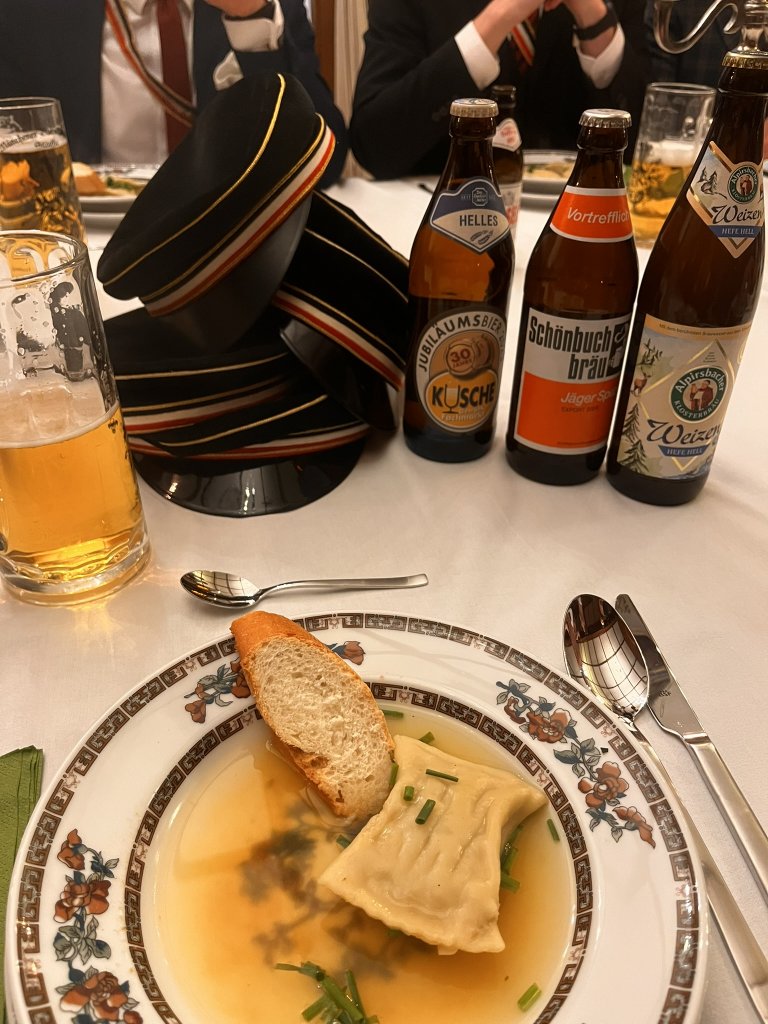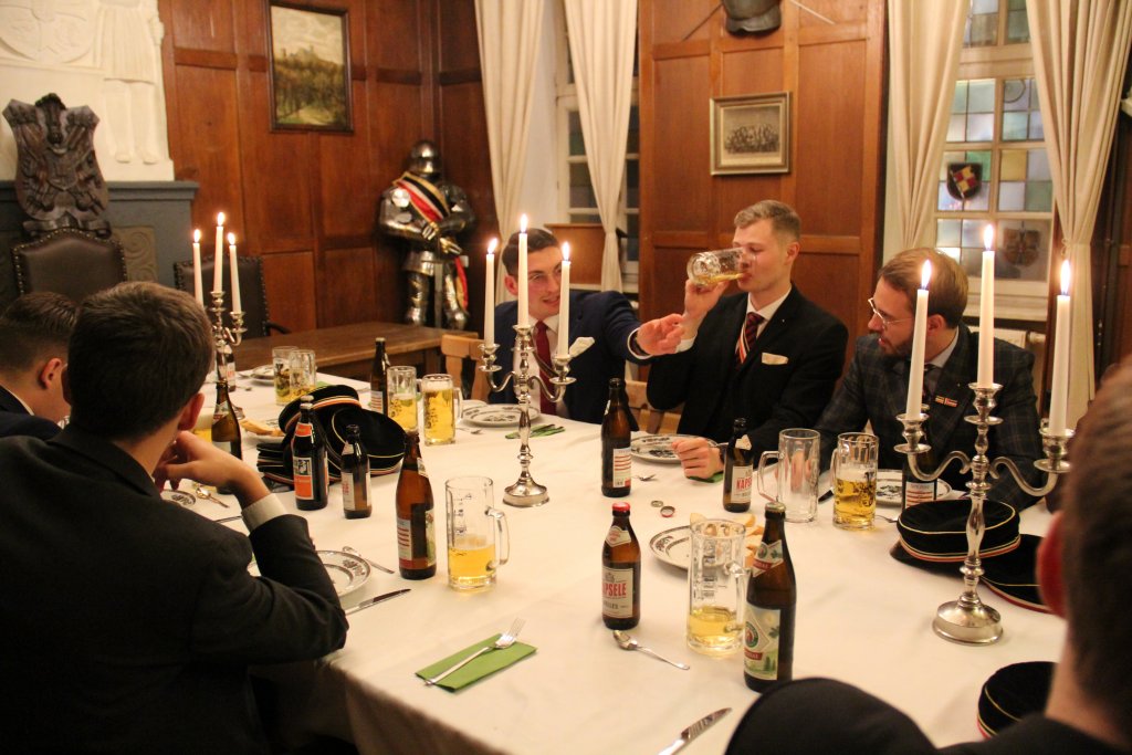 Der Abend begann im Kneipsaal, dem Herzen unseres schönen Hauses. Für den Abend war ein Drei-Gänge-Menü und eine Verkostung von vier verschiedenen Biersorten geplant, alles thematisiert auf Schwaben. Als der Appetit wuchs, kam der erste Gang des Abends: Maultaschensuppe, begleitet von einem köstlichen Bier. Nach einer kleinen Pause, um sich mit Freunden zu unterhalten und schöne Momente auszutauschen, kam das Hauptgericht: Schwabenteller, bestehend aus gebackenen Schweinefilets in Sahnesoße mit Champignons, begleitet von hausgemachten Spätzle. Natürlich musste dieses Gericht mit einem Weihenstephaner Weizenbier serviert werden, um die Kehle zu schmieren und den Durst zu löschen. Obwohl wir zu diesem Zeitpunkt alle bereits satt waren, durfte der Nachtisch nie fehlen. Unser Vergnügungswart kümmerte sich darum, köstliche Schwarzwälder-Becher mit Schokoladeneis, Kirschen in Kirschwasser und natürlich Schlagsahne mit Schokoladenstückchen vorzubereiten.