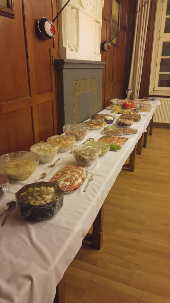 Am Abend konnten sich Gäste und Bundesbrüder in lockerer Atmosphäre austauschen sowie ein reichhaltiges und sehr leckeres Buffet genießen. Dieses ließ keine Wünsche offen, denn von Salat über Käse, Fisch- und Fleischkreationen bis zum Dessert durfte wieder einmal nichts fehlen. Die gemütliche Runde wurde durch eine stattliche Anzahl an Gästen bereichert: Vertreter von Burschenschaften, eines Corps, zweier Münchener Damenverbindungen sowie nichtkorporierte Gäste. Ein solch vielfältiges Publikum ermöglichte naturgemäß lebhafte wie interessante Diskussionen und Gespräche in einer feuchtfröhlichen wie freundschaftlichen Atmosphäre.