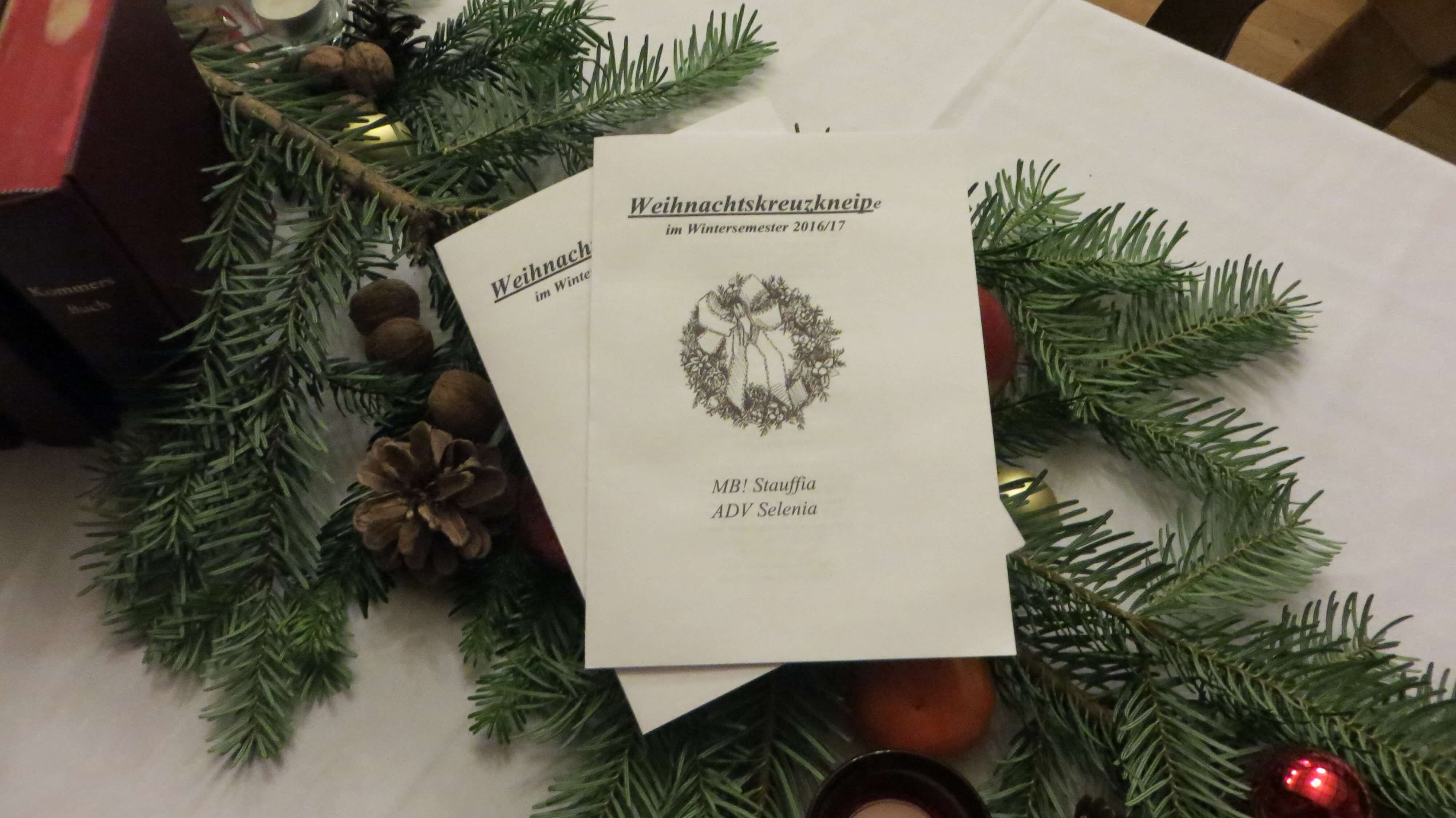 Wie immer durften wir auch heuer eine Vielzahl an Gästen aller Korporationsarten, sowie nichtkorporierte Gäste auf unserem Haus begrüßen. Natürlich war unser Kneipsaal auch dieses Jahr, dem Anlass entsprechend festlich geschmückt. Neben der Tischdekoration mit Tannenzweigen, Mandarinen und Walnüssen trug allen voran unser Weihnachtsbaum, der gemäß den Farben von Selenia und Stauffia festlich geschmückt war, zur weihnachtlichen Stimmung bei. Während unser Sprecher das sich dem Ende zuneigenden Jahr in lustiger bis polemischer Art und Weise Revue passieren ließ, erinnerte uns die Sprecherin der Selenen an die Wichtigkeit unserer Familien, der wir uns oft nur zum Weihnachtsfest wirklich bewusst sind. Im inoffiziellen Teil der Kneipe gaben die beiden Fuchsenställe in einer gespielten Chorprobe, mehrere Weihnachtslieder zum Besten – selbstverständlich auf Begriffe aus dem Alltag eines Verbindungsstudenten umgedichtet.