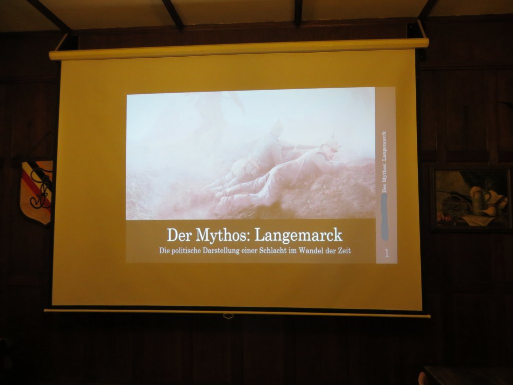 In seiner Präsentation mit dem Titel „Der Mythos: Langemark“, setzte sich der Vortragende anhand vieler geschichtlicher Zitate und Werke, kritisch mit der Bedeutung der Langemark-Schlacht des ersten Weltkriegs auseinander. Zuerst wurde die Schlacht ansich und die Rolle der deutschen Studenten thematisiert, die als Frontsoldaten zahlreich in Langemark ihr Leben ließen. Anschließend ging der Vortrag auf die Instrumentalisierung der Schlacht während des ersten Weltkriegs, deren Missbrauch durch die Politik der Weimarer Republik, bis hin zu deren Verherrlichung während des Dritten Reichs ein.